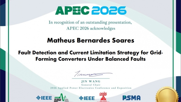 O discente de doutorado do Programa de Pós-Graduação em Engenharia Elétrica (PPGEELT), Matheus Bernardes Soares, participou da IEEE Applied Power Electronics Conference and Exposition (APEC 2026), uma das mais relevantes conferências internacionais na área de eletrônica de potência, realizada entre os dias 22 e 26 de março de 2026, em San Antonio, Estados Unidos.
