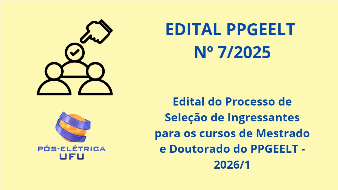 O COORDENADOR PRO TEMPORE DO PROGRAMA DE PÓS-GRADUAÇÃO EM ENGENHARIA ELÉTRICA (PPGEELT) da Faculdade de Engenharia Elétrica (FEELT) da Universidade Federal de Uberlândia (UFU), no uso de suas atribuições e considerando a delegação de competência que lhe foi outorgada por meio da Portaria de Pessoal UFU nº 4787/2025 e também pelo Estatuto e Regimento Geral da UFU e demais legislações pertinentes, torna públicas as condições gerais para a abertura das inscrições e o processo de seleção de alunos regulares para o PPGEELT, nas modalidades de Curso de Mestrado Acadêmico (período de ingresso único) e de Doutorado Acadêmico (ingresso em fluxo contínuo) no primeiro semestre de 2026.